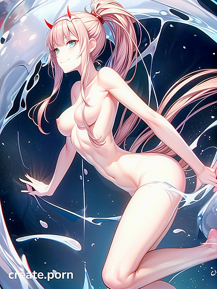 Ultra Detailed, Zero-Two (Darling in the Franxx), completely naked , ponytail hair, splashing in the water droplets of water glisten in the air, the sunlight brightens her skin, water on her body sparkles, she winks at the camera , happiest smile she can create | Made With NSFW AI Porn Generator