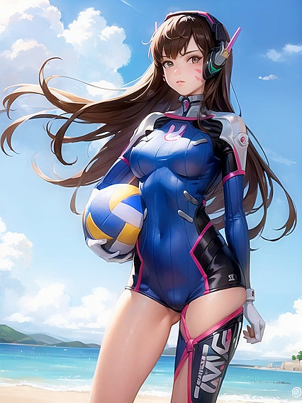 D'Va, Full body, DVa, random view, beachwear, midday, sandy beach setting, volleyball in hand, cheerful and relaxed demeanor | Made With NSFW AI Porn Generator