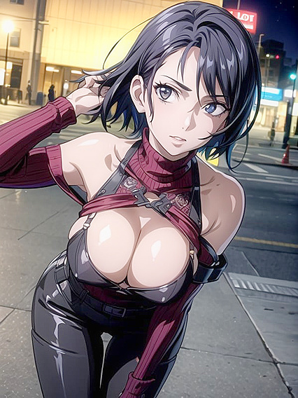 Screencap, Ada Wong , Short length, Modern city, Night, Cleavage, Off-Shoulder, Wind in Hair, Looking at Viewer, zombies | Made With NSFW AI Porn Generator