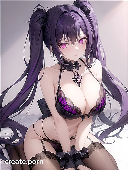, An goth girl with crystal horns and twin-tails hairstyle and glowing purple eyes + Black Lace bra and panties+ with a galaxy background | Feito com um gerador de pornografia NSFW AI
