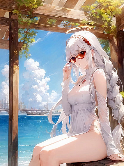 , White hair, bangs, small braid behind ear, red halo above head , sunglasses on head | Feito com um gerador de pornografia NSFW AI