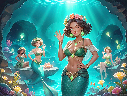 Темно-коричневая кожа, 18, Худое, Маленькая грудь, Милый, Подмигивание, Зеленые глаза, Кудрявые, Короткие волосы, Руки на бедрах, Много людей вокруг, Пещера, Нуар, nsfw, monster woman, mermaid , many mermaids around, mystical cave background, underwater library, neon green glow, holding ancient scrolls, dark ebony skin, big eyes, curly hair, rectangle body shape, straight shoulder line, bust and hips equal width, covered asymmetrical breasts, long midriff, legs, straight hips, straight ass, wearing green mermaid clothes, green shell bra, green sea jewelry, flower crown, glasses, woman waving, glow in the dark, mystical cave background, neon green glow, afterimage | NSFW с искусственным интеллектом.
