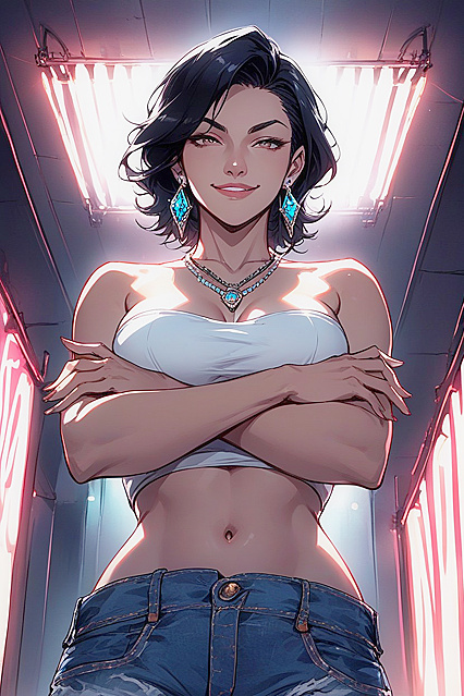 Бразильянка, 20s, Средняя грудь, Средняя задница, Самодовольное выражение, Черные волосы, Короткие волосы, Скрещенные руки, Полный рост, Снизу вверх, Серьги, Джинсовые шорты, Ожерелье, Топ без лямок, Клуб, 1 человек, Неон | NSFW с искусственным интеллектом.