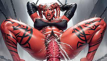 , darth talon twilek, red skin, detailed style, big eyes, tears on face, screaming, sweaty, saggy veiny breasts, thick thighs, enlarged puffy nipples, nip slip, cleavage, fishnet tank top, arm sleeves, restrained, armpits, massive puffy pussy, dirty, painfully sex, giant fat man, show ass, barbed penis, squirting pussy bounce lines, sound effects | NSFW с искусственным интеллектом.