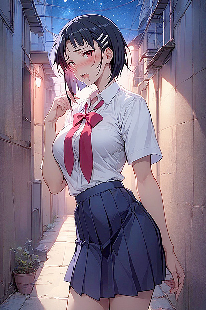 Смотрит на зрителя, Ночь, Suguha from sword art online, shy, Eyes without highlights, Monochromatic Eyes, Dark Back Alley, Blushing, Half open mouth, Drooling, Show your underwear, midnight, View from the front, no bra, School uniform, Starry sky, Flip up your skirt | NSFW с искусственным интеллектом.