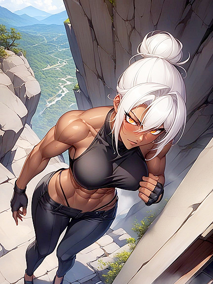 Темно-коричневая кожа, 18, В хорошей форме, Огромная грудь, Массивная задница, Kagami_Hirotaka art style, one woman, panting, orange eyes, fit body, big tits, big ass, white hair, dark skin, hair bun, straight bangs, black halter top, baggy black pants, black thong, black fingerless gloves, falling from a cliff, overhead view view | NSFW с искусственным интеллектом.