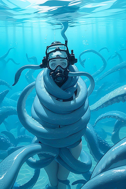 Снимок до талии, Сверху вниз, ultra detailed, accurate anatomy, scuba diver outfit, diving mask, snorkel, she is captured by giant octopus, monstrous black octopus , filthy octopus with big eyes, lots of tentacles, tentacles coiled around her body, tentacles smother her, tentacles coiling her neck, tentacles coiling her wrists, woman, underwater, arched body | NSFW с искусственным интеллектом.