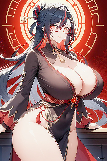 Большая грудь, Средняя задница, Female secretary, curvy, thick body, massive tits, work uniform, hypnosis, blank stare, clueless, smiling open mouth drooling, sitting on top of desk, leg spread, female masturbation, torn leggings, pov male sitting, office | NSFW с искусственным интеллектом.
