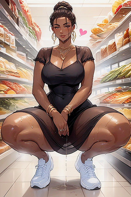Приседание, sqautting, person, alone, s, african female, thick thighs, hyper thighs, fully clothed, black dress, dress, dress, dress, white sneakers, grocery store, love hearts, sweaty, see through clothes, wet clothes, person, alone | NSFW с искусственным интеллектом.