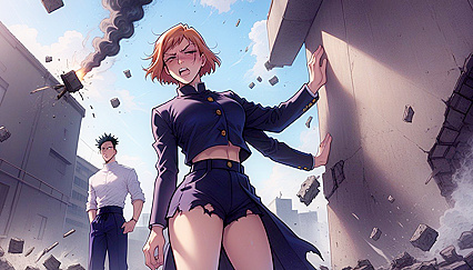 , melkor mancin artstyle, woman mahito from the anime jujutsu kaisen, torn clothes, destruction of the shibuya subway, holding on to a broken wall, guy, and, yuji itadori after the shibuya incident from jujutsu kaisen, fucks hard, mahito resists, the light of the lamps flickers and shorts out, uji itadori wears clothes from jujutsu kaisen, smoke comes from the ground from the battle, woman, man | NSFW с искусственным интеллектом.