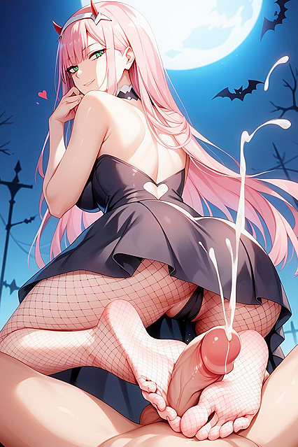 Розовые волосы, Zero Two from Darling in the FranXX, footjob, horny, extremely seductive, hand close to face, heart eyes, love hearts, fishnet stocking, halloween dress, rear view, cumshot | NSFW с искусственным интеллектом.