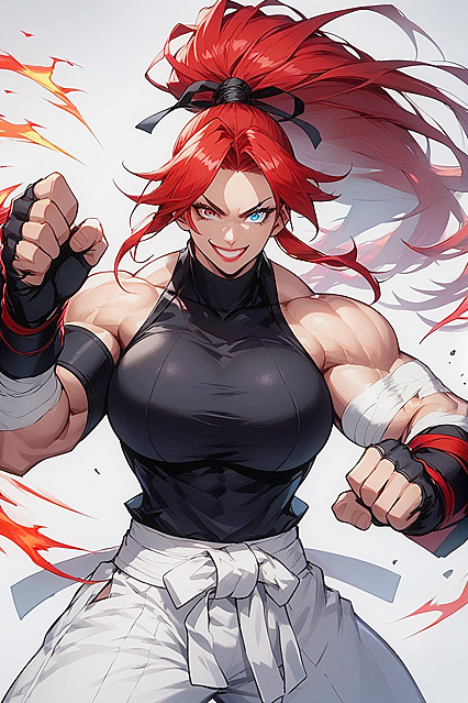 , punching, punch, upper punch, put arms out in front, one gigantic extremly muscular female, beautiful face, extremly tall, extremly muscular, large body, wide shoulders, long body, gigantic arms, gigantic biceps, gigantic forearms, large hands, gigantic ponytail, red hair, long strands of hair near her face, visible forehead, ponytail tied with a black ribbon, heterochromiablue eye, red eye, pink lips, baggy white martial arts pants, white pants, black martial arts belt, black sleeveless turtleneck, black fingerless gloves, bandaged arms, black armbands, fighting pose, combat stance, smiling, proud face, front view, completly white background, wide view | NSFW с искусственным интеллектом.