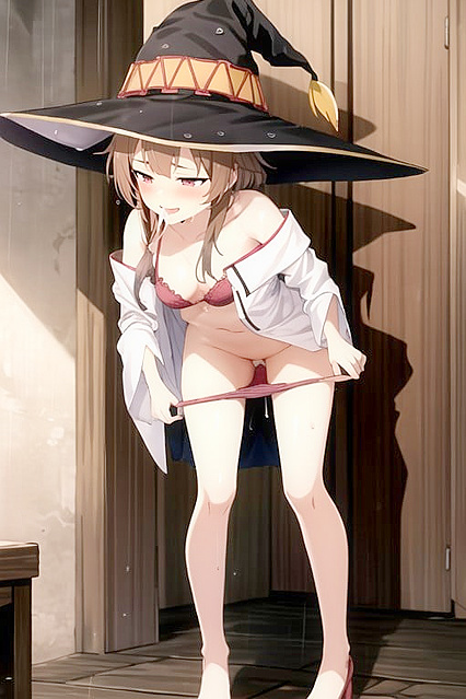 Мегумин (Квартет из исекаев), Сексуально возбужденный, Снятие трусиков, Кремпай, Рот открыт, Открытая одежда, Мокрая одежда, Полный рост, Снизу вверх (под юбку), Кошачьи уши, Мини-юбка, Мушоку Тенсей, astolfs pantie, pink pantie, pink bra, plus anal | NSFW с искусственным интеллектом.