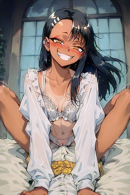 Худое, Маленькая грудь, Подленький (улыбается, краснея), Распространенная вагина, Расширенный анус, Смотрит на зрителя, Пирсинг сосков, Полный рост, Спереди, Белье, Церковь, nagatoro from donttoy withme miss nagatoro, white lingerie, tan skin, bounce lines, black hair, yellow ayes, position | NSFW с искусственным интеллектом.