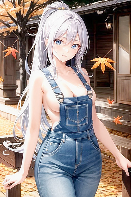 , woman, solo, cowboy shot, silver hair, long hair, ponytail, hair between eyes, blue eyes, clazy eyes, crazy smile, naked overalls, medium breasts, autumn leaves, red leaves, fall leaves, high resolution, ultra detailed | NSFW с искусственным интеллектом.