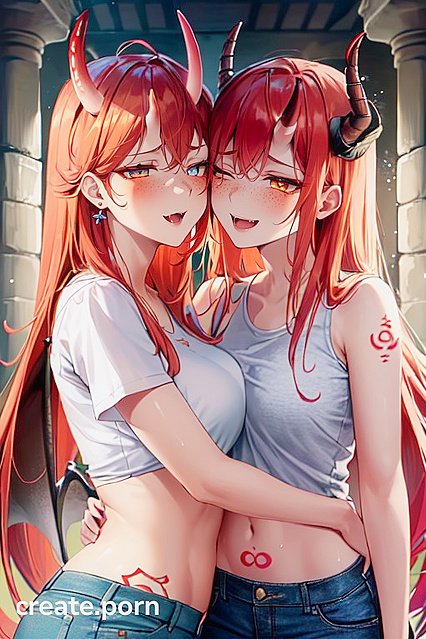 Soft Pastel, Red Skin, Ginger, Girls Kissing, Tattoo, Glowing Eyes, 18, Mischievous (Smiling While Blushing), Green Eyes, Long length, Straight, Ginger, Fit, Medium Breast, Rounded Ass, Devil, Angel, Casual, 2 People, | Made With NSFW AI Porn Generator