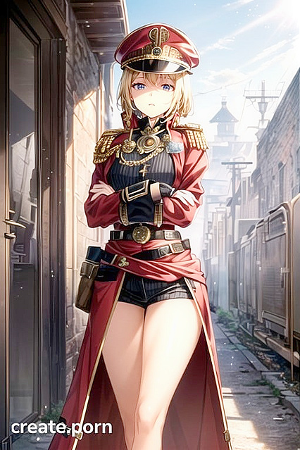 Ultra Detailed, Waist Shot, Add Detail, SFW, Fit, Rounded Breast, closed up steampunk army commissar uniform trenchcoat robe arms crossed under her chest thin waist Short blonde hair officer hat long buttoned up red officer commissar uniform | Made With NSFW AI Porn Generator