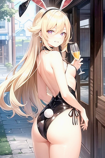 Fischl (Genshin Impact), Rear View, 18, Wink, Pink Eyes, Slicked, Skinny, Natural Breast, Small Ass, Bunny Costume, drinking alcohol see ass | Made With NSFW AI Porn Generator