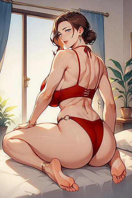 FitBrunetteinRedBikiniSitsonBedwithFirmAssandRoundBoobsHentaiAIPorn