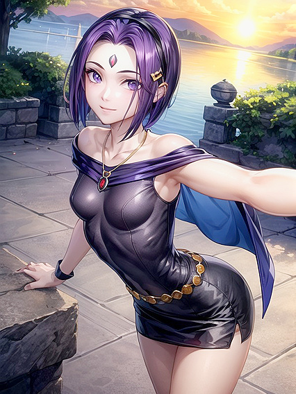 Raven (Teen Titans), Front View, Waist Shot, Pale Skin, Selfie, Selfie, Add Detail, Off-Shoulder, Wind in Hair, Looking at Viewer, Happy, Purple Eyes, Short length, Purple Hair, Fit, Small Breast, Rounded Ass, Hair Clip, Hair Band, Blouse, Mini skirt, Necklace, Lake, 1 Person, Sunset, | Made With NSFW AI Porn Generator