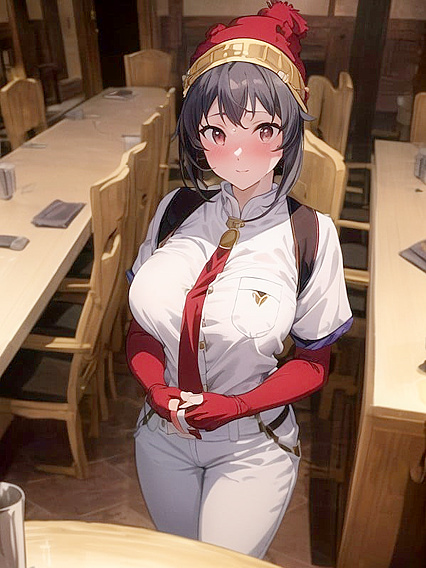 Mushoku Tensei, Top Down, Japanese, Arms Together, Model, Looking at Viewer, Add Detail, Embarrassed , Brown Eyes, Bobcut, Very Short Hair, Black Hair, Thick, Large Breast, Rounded Ass, Beanie, Office shirt, Mansion, 1 Person, Fuuko Izumo from Undead Unluck, solid red beanie, red beanie has a rectangle on the front saying "good luck" , red gloves, she is super shy and cute, very short black hair, she stands only ', Red Tie, solid white office shirt, black khakis, accurate face, accurate fingers, accurate humanistic angles, a knights roundtable behind her in the expensive mansion, big chairs placed around the roundtable, holding a black katana to her chest, still sheathed, a golden emblem on her left breast pocket | Made With NSFW AI Porn Generator