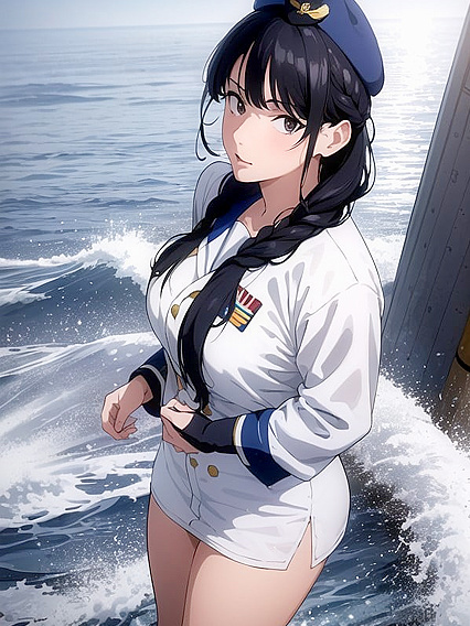 Detailed Screencap, Front View, Mouth Agape, Wind in Hair, Looking at Viewer, 18, Bangs, Braided, Pigtails, Black Hair, Fat, Military, 1 Person, Raining, standing on the deck of a battleship, stormy waves crashing violently in the background, sailor's cap, sailor's uniform, Wallpaper of a korean sailor dynamically posing with the Korean flag, wearing a full korean military uniform, strong pose, determined face | Made With NSFW AI Porn Generator