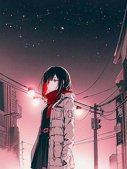 Mikasa Ackerman, Anime style wide shot, cute girl character with striking red eyes, dressed in stylish winter attire with a fur-lined hood and gloves, standing alone in a snowy, dimly lit Tokyo street at night, her breath visible in the cold air, expression mixed with melancholy and thoughtfulness, snowflakes gently falling around her, adding to the somber yet beautiful atmosphere, distant city lights casting a subtle glow on the snow, a faint hint of a ghoul-like aura emanating from her, referencing Tokyo Ghoul's theme, overall tone dark but with pops of color from neon signs and her eyes, cinematic composition with a focus on her face and the winter backdrop | Made With NSFW AI Porn Generator