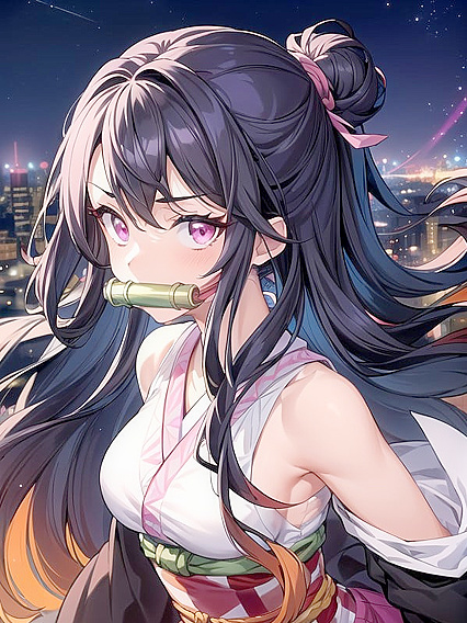 Thick Lines, Nezuko (Demon Slayer), Waist Shot, 1 Person, Night, masterpiece, best quality, girl, colorful fireworks in the night sky, night time tokyo skyline in the background, looking at camera, subject is wearing a colorful kimono, subject's hair tied back into a hairbun | Made With NSFW AI Porn Generator