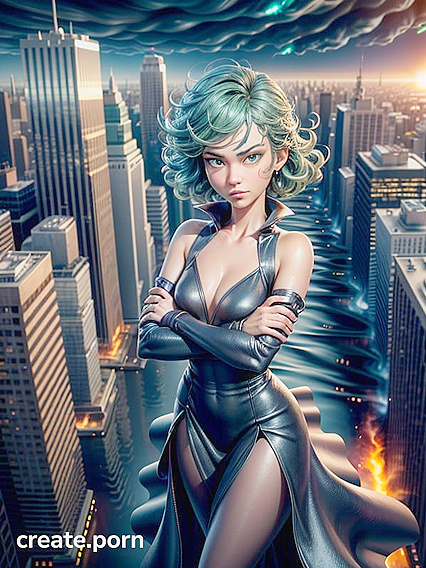 3D, Tatsumaki (One Punch Man), Top Down, Standing, Wind in Hair, 20+, Angry, Green Hair, Skinny, Small Breast, Dress, City, Rain, arms crossed , mouth close , her feet are hovering up in the air , mini people in the city , mini people are running for their lives , tsunami taking out mini people , meteor falling from the sky , tornados in the background , Giant tsunami is washing away everything in the city , climactic , cinematic , buildings exploding , world on fire , waves crashing into skyscrapers , aerial view over city , city destroyed , disaster strikes the city , her face is upset , flowy dress in the wind , she is flying , accurate human hands and limbs , Collapsed building | Made With NSFW AI Porn Generator