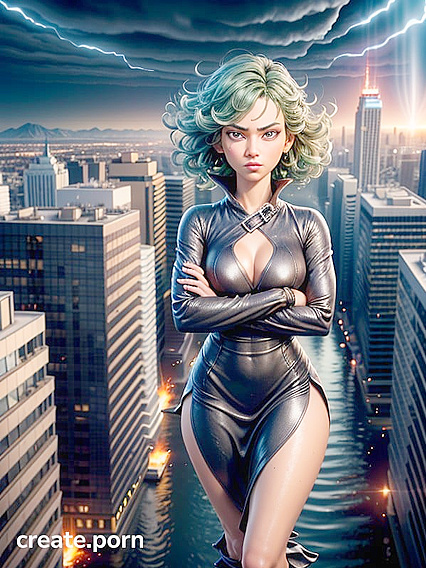 3D, Tatsumaki (One Punch Man), Top Down, Standing, Wind in Hair, 20+, Angry, Green Hair, Skinny, Small Breast, Dress, City, Rain, arms crossed , mouth close , her feet are hovering up in the air , mini people in the city , mini people are running for their lives , tsunami taking out mini people , meteor falling from the sky , tornados in the background , Giant tsunami is washing away everything in the city , climactic , cinematic , buildings exploding , world on fire , waves crashing into skyscrapers , aerial view over city , city destroyed , disaster strikes the city , her face is upset , flowy dress in the wind , she is flying , accurate human hands and limbs , Collapsed building | Made With NSFW AI Porn Generator