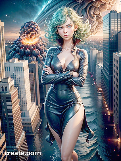 3D, Tatsumaki (One Punch Man), Top Down, Standing, Wind in Hair, 20+, Disgust, Green Hair, Skinny, Small Breast, Dress, City, arms crossed , mouth close , her feet are hovering up in the air , mini people in the city , mini people are running for their lives , tsunami taking out mini people , meteor falling from the sky , tornados in the background , Giant tsunami is washing away everything in the city , climactic , cinematic , buildings exploding , waves crashing into skyscrapers , aerial view over city , city being destroyed , disaster strikes the city , her face is upset with the world , flowy dress in the wind , she is flying , accurate human hands and limbs | Made With NSFW AI Porn Generator