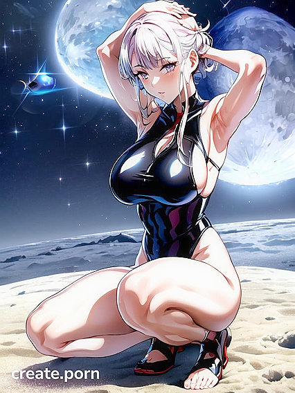 , microkini , knees in the moon sand , upright on her knees , beautiful view of earth in the background , windy hair, stars in space surrounding her, arms up , one hand holding on to her head , shiny body , cute face, smiling for the camera, full body , front view | Feito com um gerador de pornografia NSFW AI