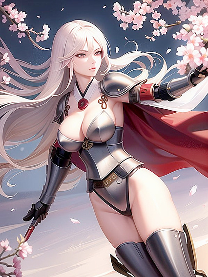 , Full body, samurai waifu, traditional yet stylized armor, silk robes flowing with armor plates strategically placed, high-resolution, cherry blossom tree in bloom behind her, katana drawn and posed, inviting yet formidable demeanor | Feito com um gerador de pornografia NSFW AI